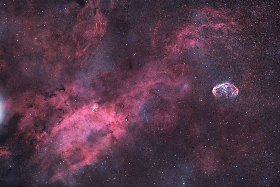 Au cœur de la constellation du Cygne, l’étoile Sadr (Gamma Cygni) illumine une vaste région céleste riche en nébulosités, notamment la nébuleuse du Papillon (IC 1318). Cette zone, baignée de gaz ionisés et de poussières cosmiques, révèle de somptueuses draperies éthérées visibles en imagerie à bande étroite. Sadr, une supergéante jaune 150 fois plus large que le Soleil, émet une énergie colossale qui met en lumière ces structures complexes. Non loin de là, la nébuleuse du Croissant (NGC 6888) se distingue par sa forme arquée et son origine spectaculaire : elle résulte des vents stellaires violents de l’étoile Wolf-Rayet WR 136, qui ont sculpté une bulle de gaz en émission à environ 5 000 années-lumière de la Terre. Ensemble, ces joyaux célestes offrent un panorama saisissant de la dynamique et de la beauté du cosmos.