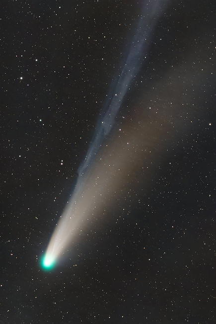 La comète C/2025 A6 (Lemmon) est un visiteur glacé du système solaire, capturé ici dans toute sa splendeur. Son noyau brillant, teinté de vert-bleu, est le signe de la présence de gaz comme le cyanogène (CN) et le carbone diatomique (C₂), qui fluorescent sous l’effet du rayonnement ultraviolet solaire.